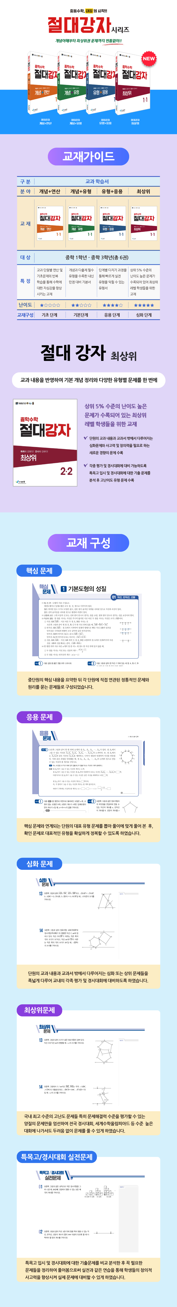 사고력과 창의력을 필요로 하는 상위 5% 수준의 난이도 높은 문제가 수록되어 있는 특목고, 영재고, 최상위 레벨 학생들을 위한 교재